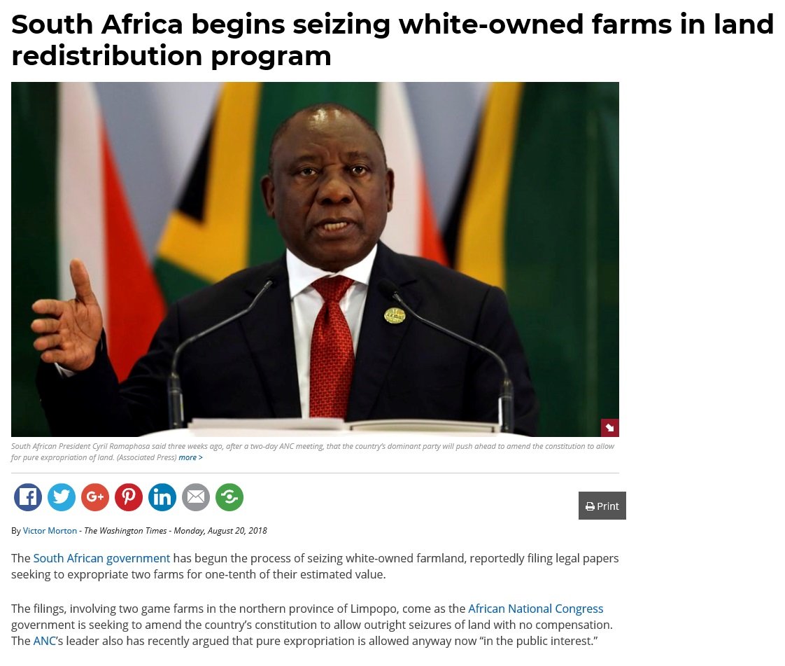 남아공 정부는 8월20일, 토지 재분배 프로그램을 발표하고 백인 농장주가 소유한 토지의 일부를 농장주의 동의없이 (사실상 시가의 10분의 1 가격으로) 사들이겠다는 정책을 발표했다. 말이 좋아 정부가 매수한다는 거지 사실상 몰수나 다름없기 때문에 강한 반발이 예상된다.
