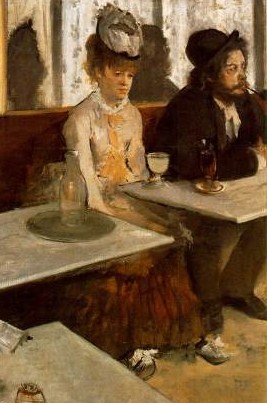 너무나 표현이 잘되어 있다. 뒷벽의 그림자로 봤을 때 어둠이 깔려가는 초저녁 무렵이고 한쌍의 남녀가 압생트 한 병과 술잔을 놓고 나란히 앉아 있는 모습이다.