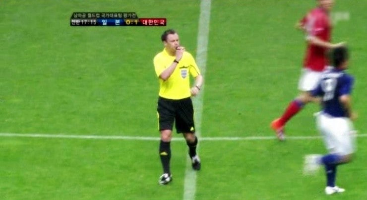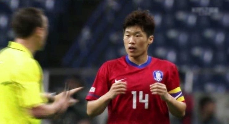어슬렁 어슬렁 이청용 도착 몰랐다는 제스쳐로 일관中 주심 계속 박지성과 대화한 결과 이청용 무죄 입증 성공