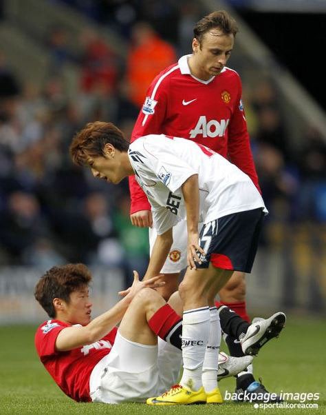 맨유vs볼튼과의 경기에서 박지성이 볼튼 선수와의 충돌로 넘어졌는데 이청용이 달려와서 손잡아 일으켜줌