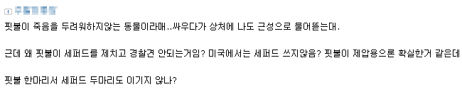 이미 세퍼트는 혈통 고정이 확실하게 되었고 훈련빨 좋다. 경찰견으로 훈련된 세퍼트 영상만 보더라도 범인물면 미친듯 안 놓는데 핏불 써봐라.