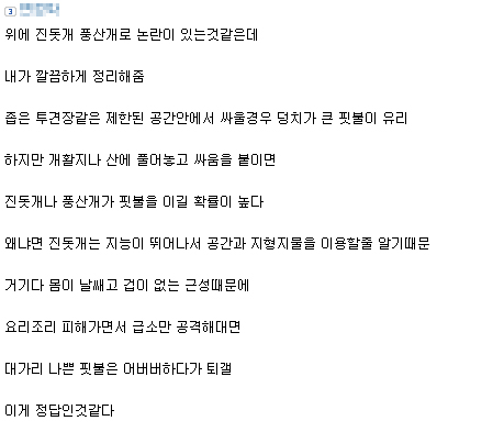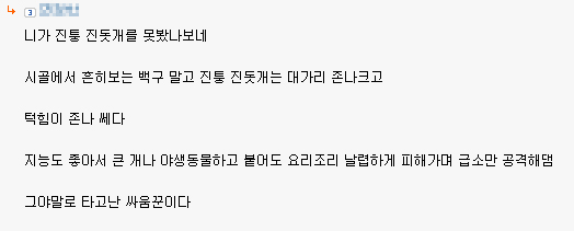 어제 핏불관련글에 적힌 댓글에 뭐 진돗개가 싸움을 존나 잘하고 날렵해서 이리 저리 피해다녀서 핏불한테 이긴다느니
