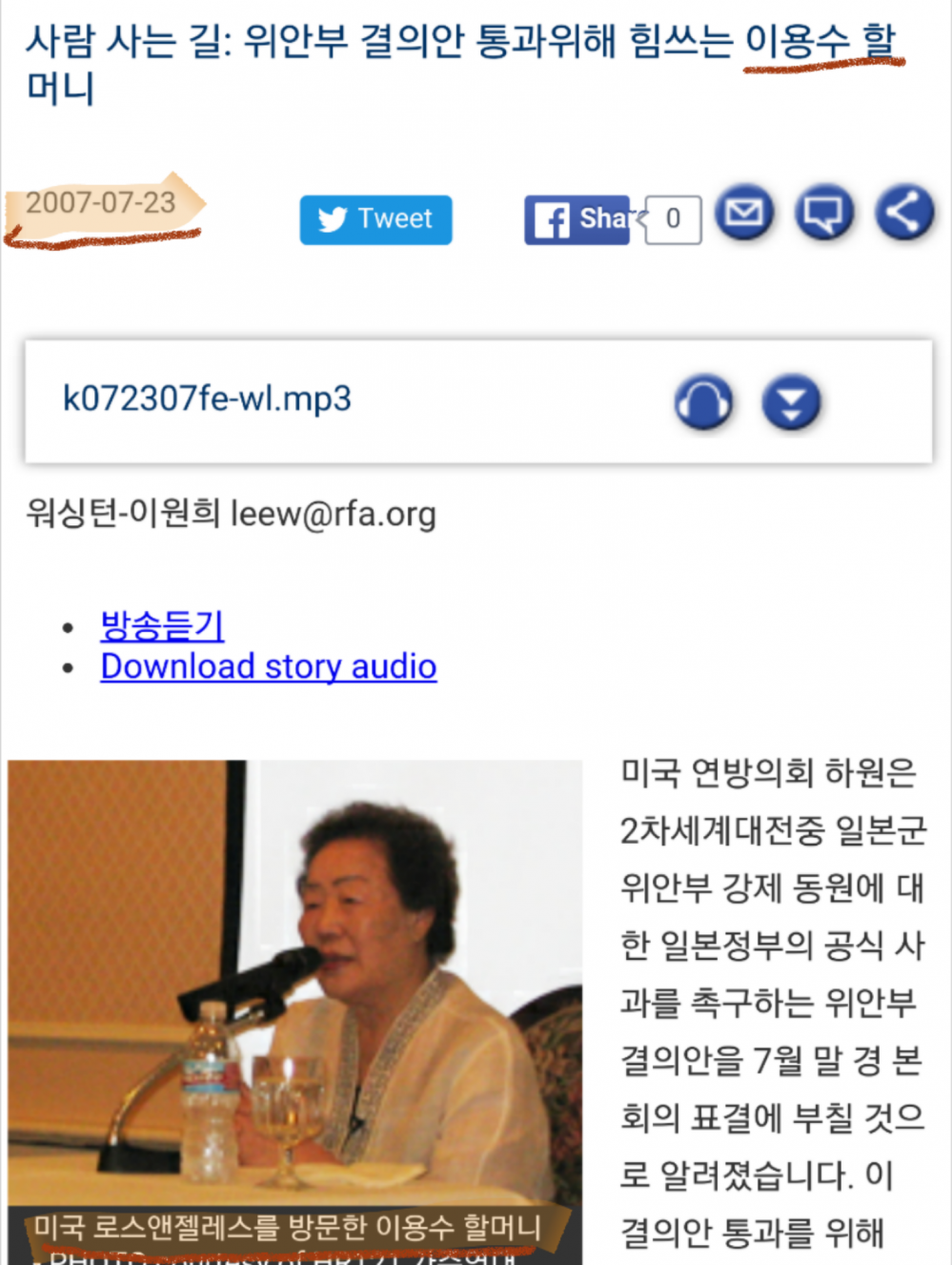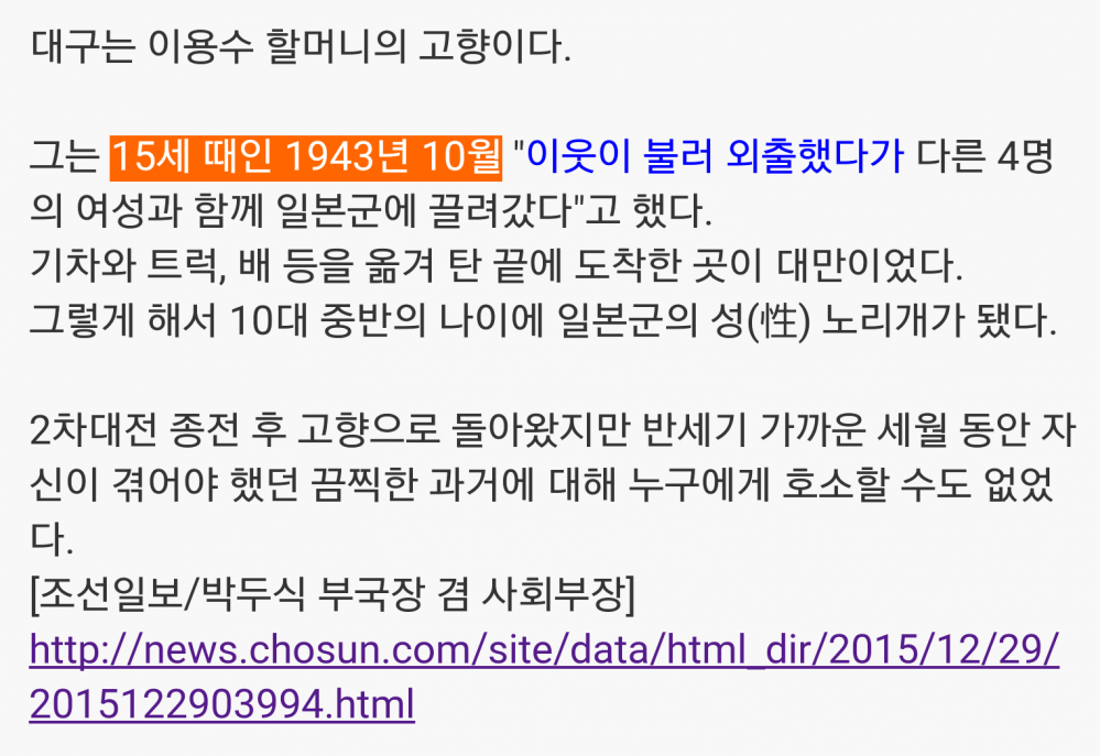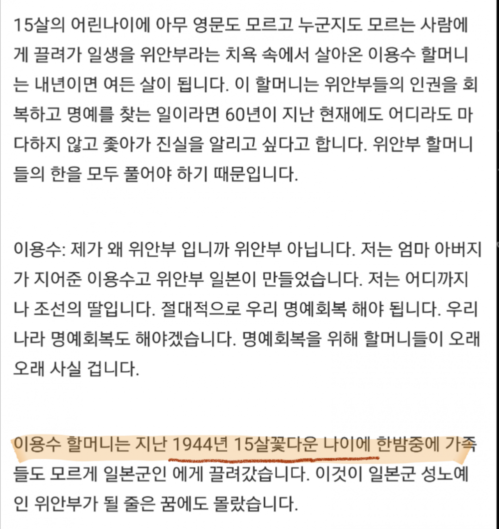 이용수 할머니가 미국에서 연설한 내용을 기사로 쓴 것을 찾았다. (ㅋㅋㅋㅋㅋ)