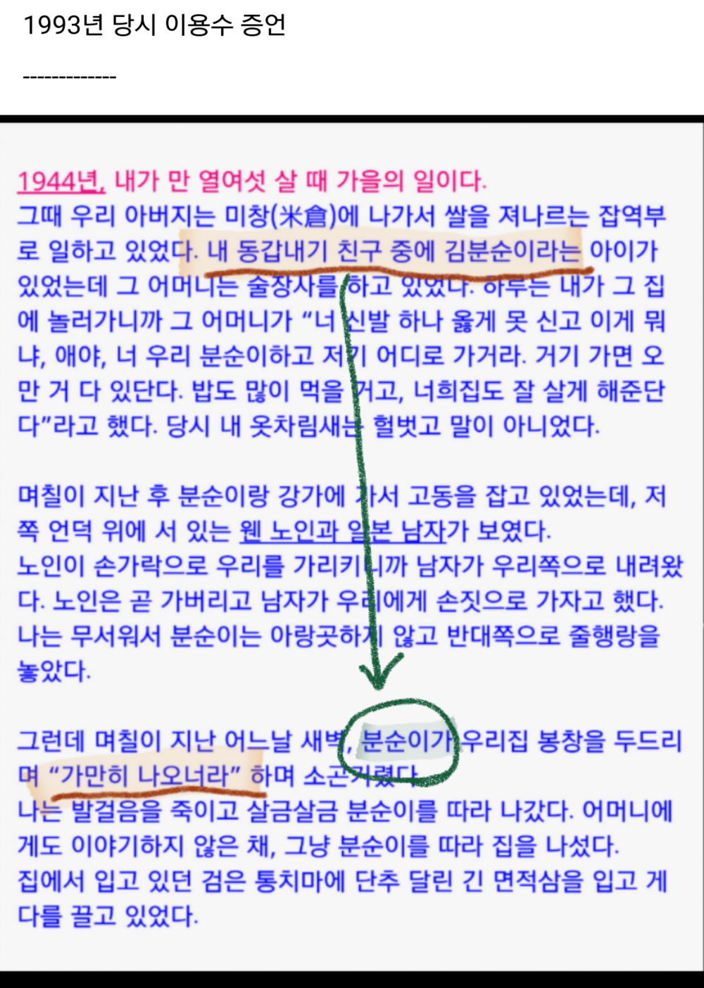 그런데, 이미 1993년에 동갑내기 친구 ''김분순''이라고 언급을 했는데,