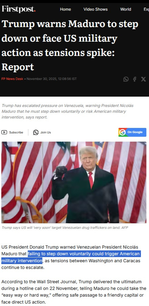 (한줄요약) WSJ에 따르면 마두로가 망명 거부하면 베네수엘라는 드론과 AI 기술이 결합된 미국 신무기 실험장이 될 것이라고 함