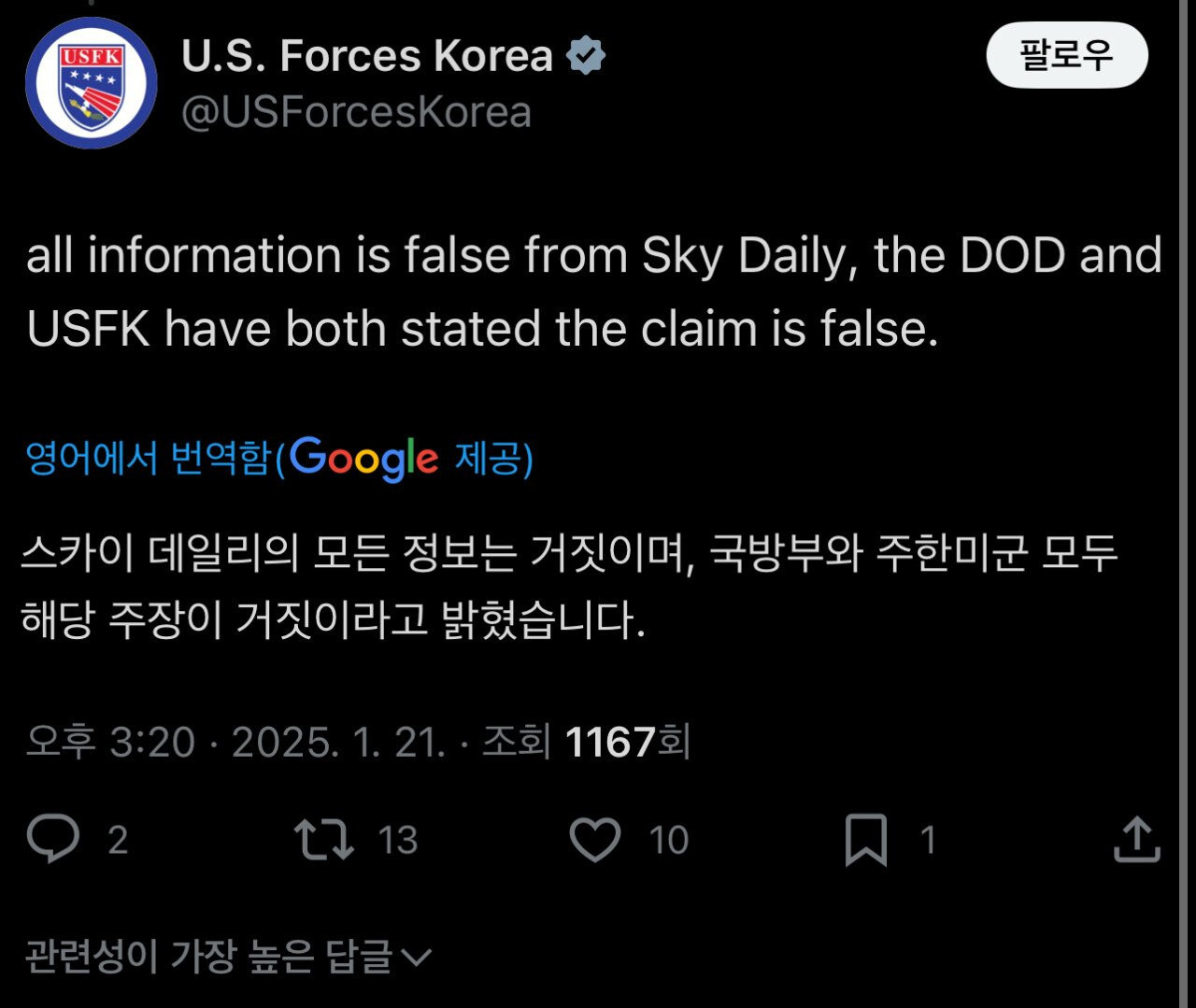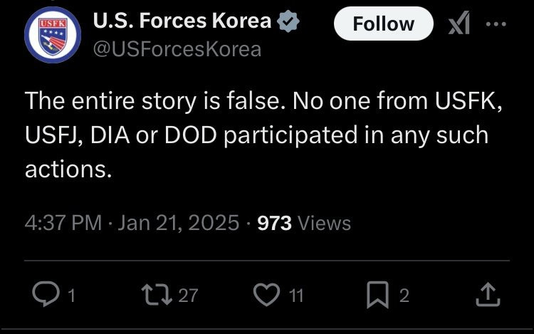 주일미군인지 DIA인지 DOA인지 다 개소리 말라고 써놨는데