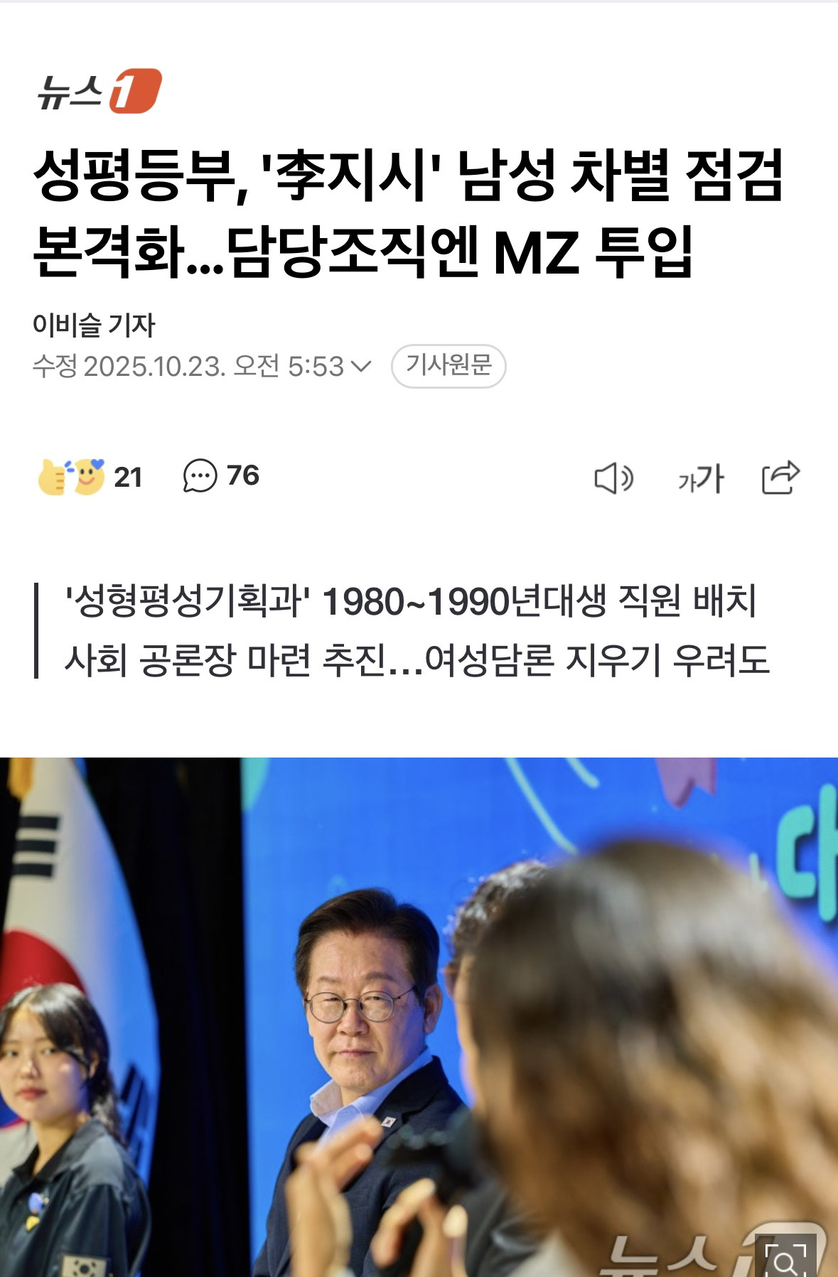 명칭을 변경한 찢통 곧바로 지시 남성 차별 점검 본격화 담당 조직엔 MZ투입 ㄷㄷ