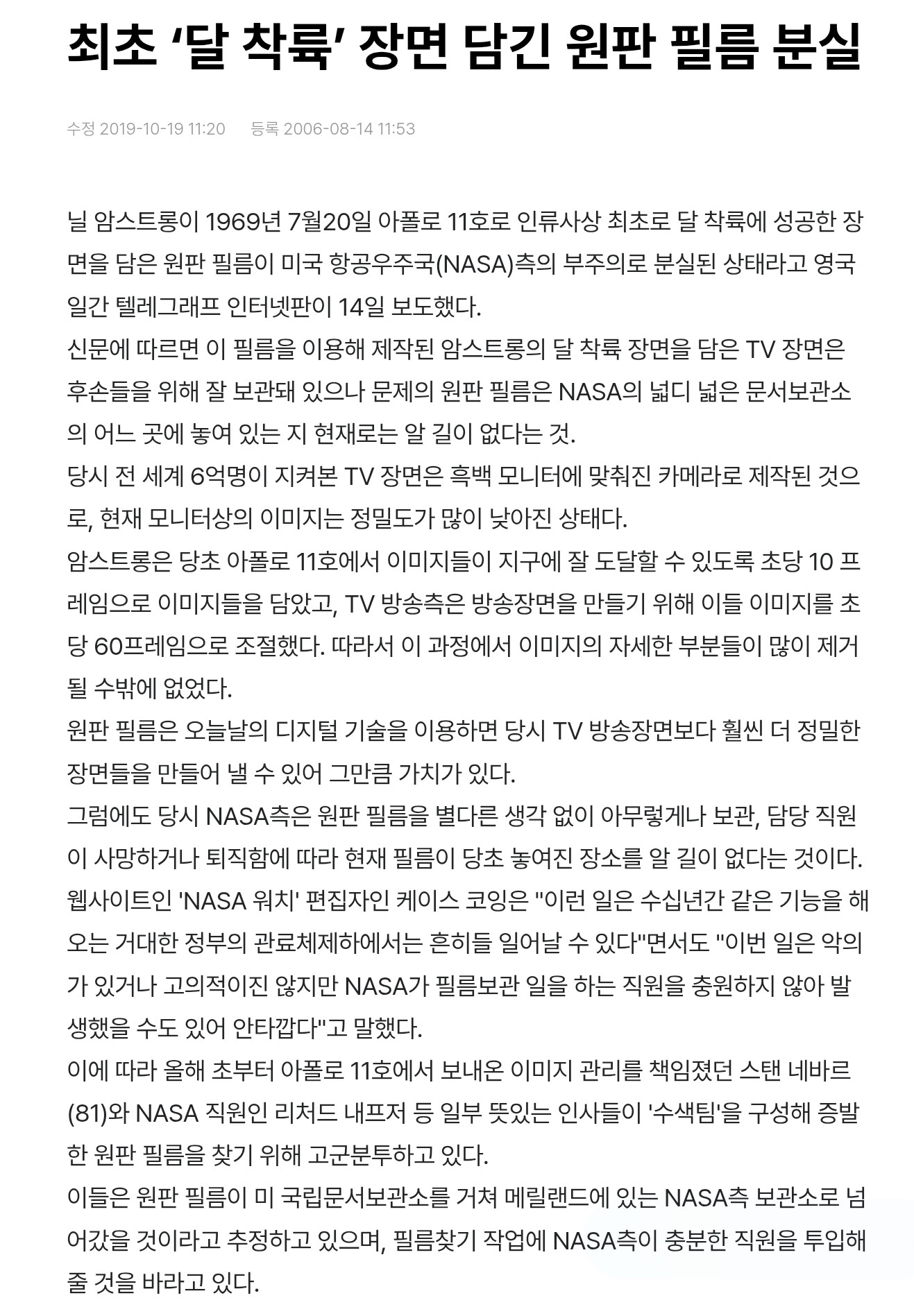 오리지널 원판 필름도 분실했다는 NASA