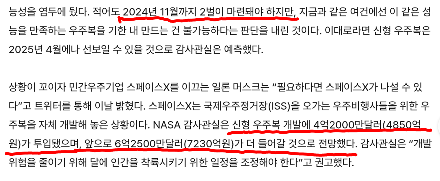 1조 5천억원을 쳐발라도 우주복 두벌을 못만들고 있는 현실...