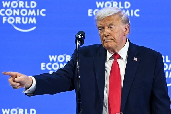 지난 21일 도널드 트럼프 미국 대통령이 스위스 다보스포럼에서 연설 중 손짓을 하고 있다. /연합