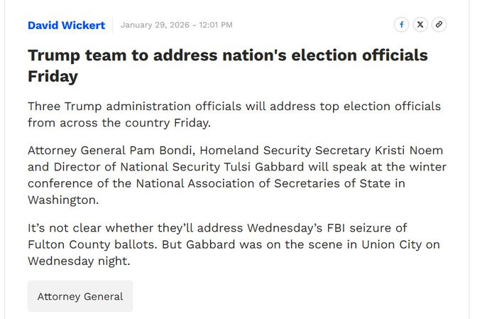데이비드 위커트 트럼프 행정부, 전국 선거 관리 책임자들에게 연설 예정 금요일 트럼프 행정부 고위 관리 3명이 금요일, 전국 각지의 선거 관리 책임자들을 대상으로 연설할 예정입니다. 팸 본디 법무장관, 크리스티 노엠 국토안보부 장관,툴시 가바드 국가안보국장은 워싱턴에서 열리는 전국 주무장관협회 동계 회의에서 연설할 예정입니다. 이들이 수요일 FBI의 풀턴 카운티 투표용지 압수 사건에 대해 언급할지는 확실하지 않습니다. 하지만 가바드 국장은 수요일 밤 유니언 시티 현장에 있었던 것으로 알려졌습니다. 법무장관 2026년 1월 29일 오후 12시 01분 위의 이미지 2을 번역하면!!!