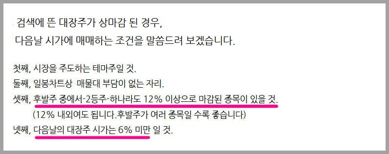 누누히 말씀드렸던 '황금 검색에 뜬 상마감한 대장주의 다음날