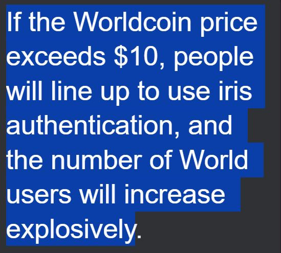 If the Worldcoin price exceeds $10, people will line up to use iris authentication, and the number of World users will increase explosively. 월드코인 가격이 10달러를 넘어가면 홍채인증 하려는 사람들이 줄을 설 것이고 월드 이용자는 폭발적으로 증가하게 된다 사용자의 증가는 월드코인의 지수적 성장을 이끌 것이고 결국 top 5 코인으로 만들계획 2024년 월드코인 폭등 당시 뉴스요약 월드코인 10불 위로 유지되면 홍채인증 존나 줄서고 월드코인 폭등해서 시총 비트코인 넘어서게 될것