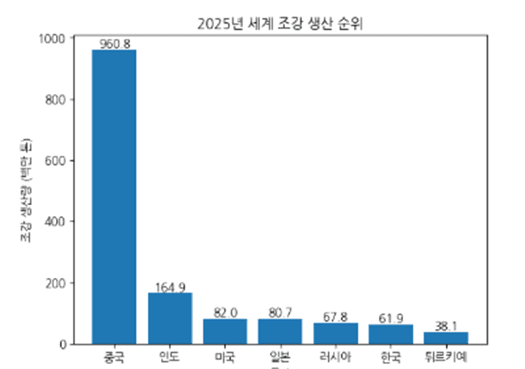 주목할 점은 3위권 이하 국가들의 명암이다. 5위 러시아는 6780만t을 생산하며 상위권을 유지했지만, 지정학적 리스크와 서방의 제재로 성장세는 제한적인 모습이다. 내수 중심의 생산 구조로 버티고는 있으나, 글로벌 시장 영향력은 과거에 비해 크게 약화됐다는 평가가 나온다.