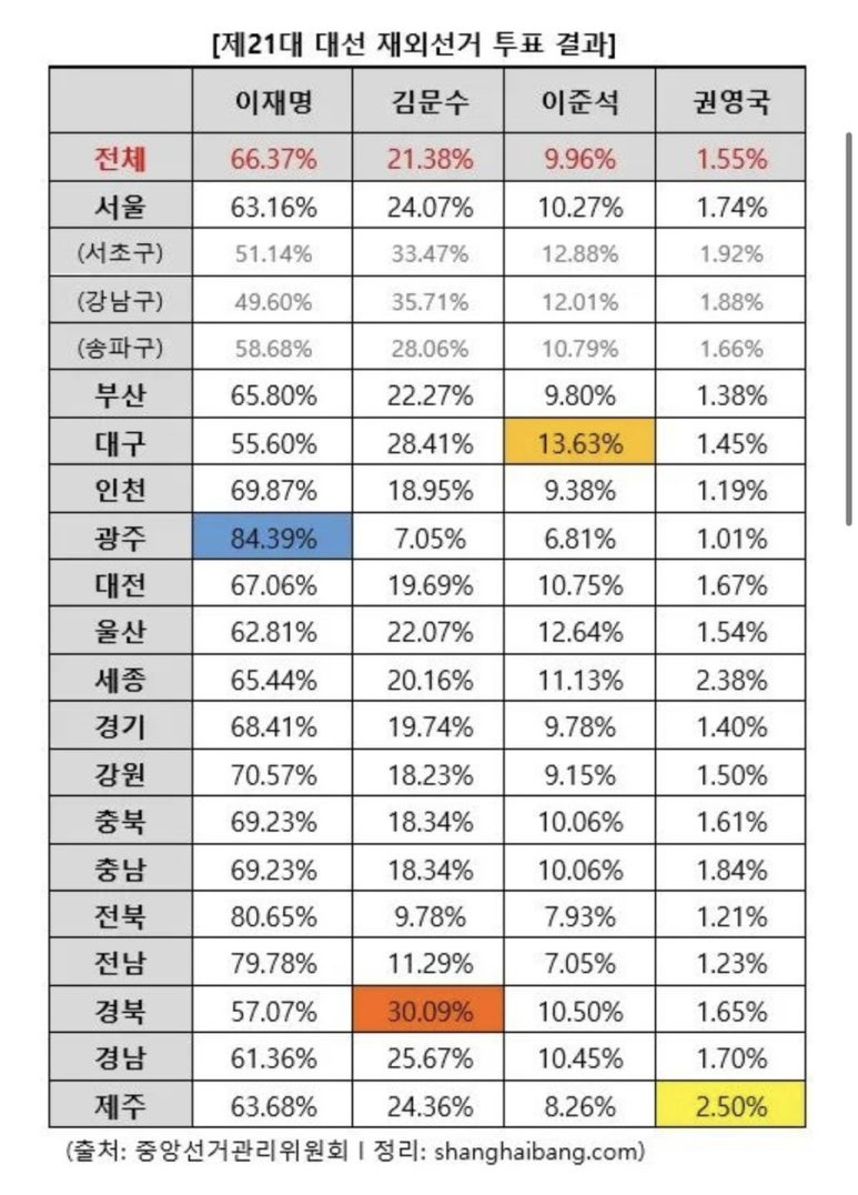 투표결과는 본국에서 사전투표와 본투표를 합산한결과와 비슷해야한다. 최종 대선결과 7%차이로 이재명이 이겼기때문에