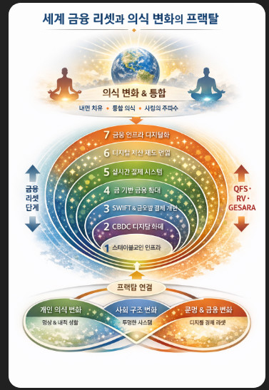 이 그림 하나로 금융 리셋 7단계 + 8번째 의식 신호를 프랙탈 구조로 한눈에 볼 수 있어서 정말 직관적이죠.