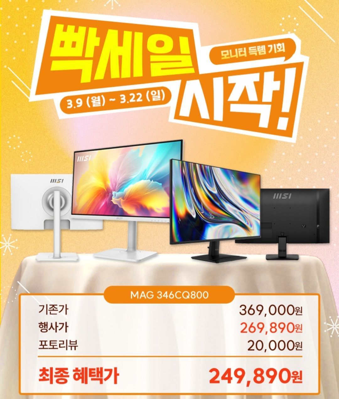 MSI MAG 346CQ800 게이밍모니터 UWQHD 180 모니터 10% 할인 쿠폰 농협카드 7% 할인시 269,890원