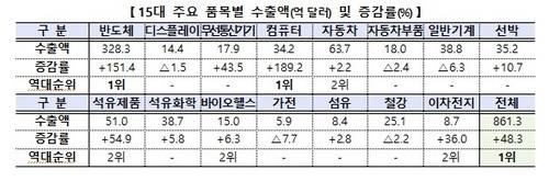 조업일수를 고려한 일평균 수출도 41.9% 급증한 37억4천만달러를 기록해, 역대 최대 실적을 경신했다.