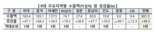 지역별로는 9대 주요 수출지역 중 7개 지역 수출이 늘었다. 중국, 미국, 아세안, EU, 중남미, 일본, 인도다.