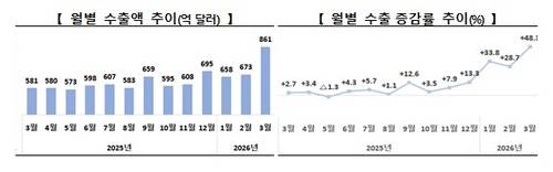 1일 산업통상부가 발표한 '2026년 3월 수출입 동향'에 따르면 지난달 수출은 전년 동월 대비 48.3% 급증한 861억3천만달러를 기록했다.