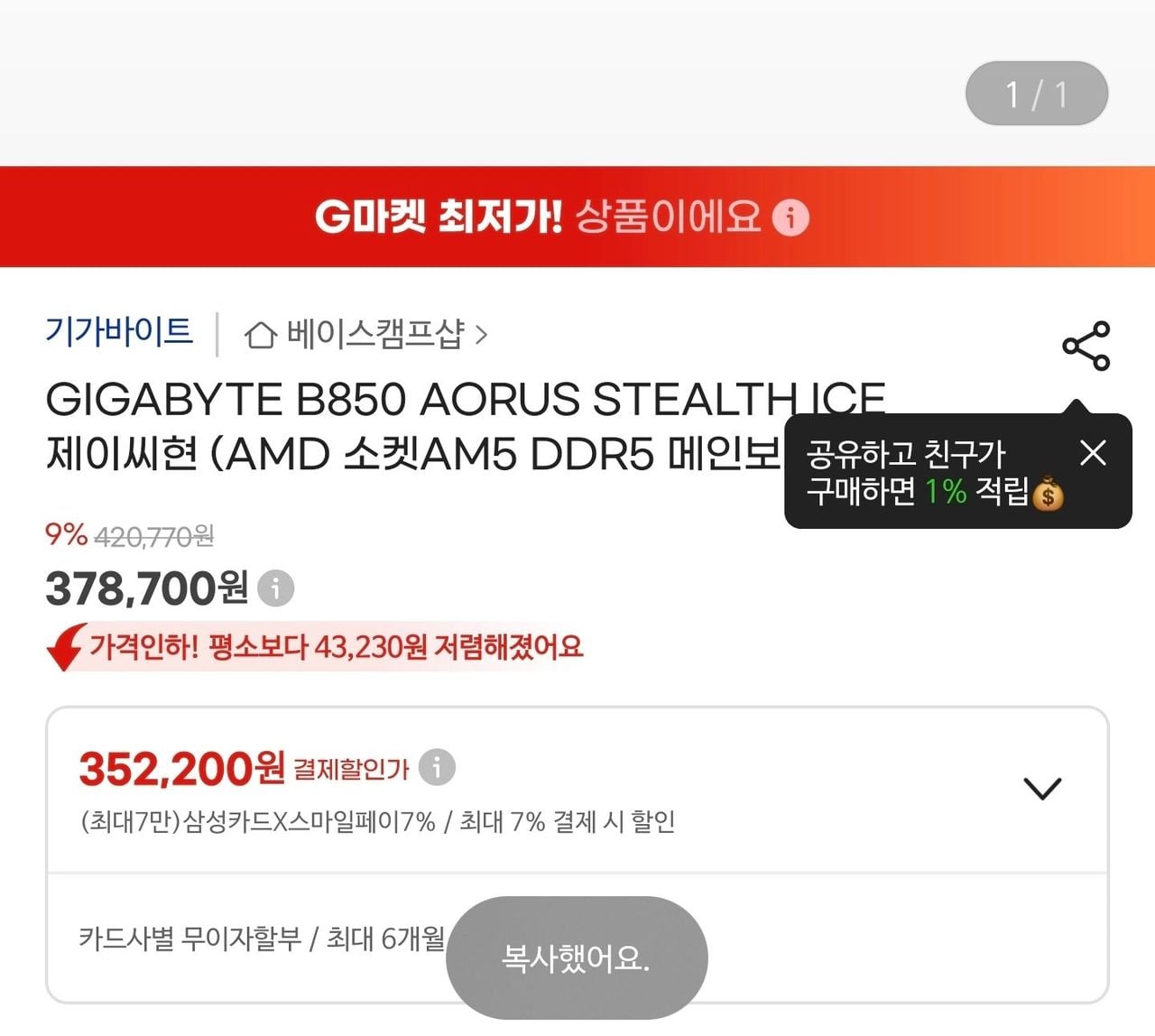 : 지마켓] B850 AORUS Stealth Ice 체감가 31만원대