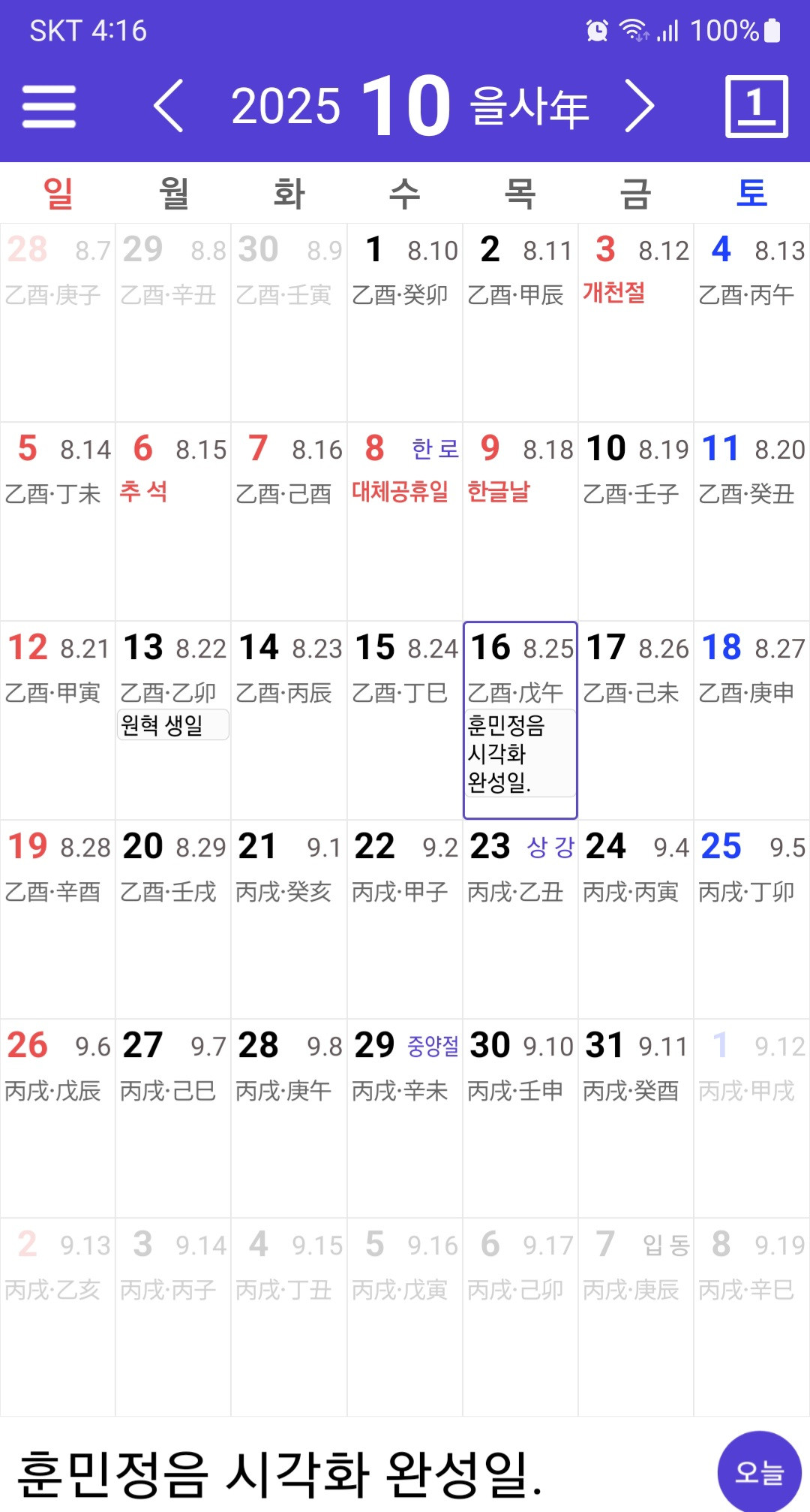 오늘, 2025년 10월 16일(음력 8월 25일, 목요일),