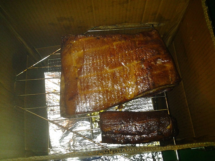 원래는 이렇게 그릴위에 얹어놓으면 안되고..... 정육점 고기걸이에 꽂아서 세로로 길다란 박스에 걸어놔야 골고루 훈연된다...