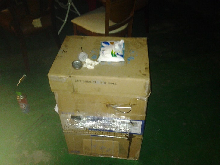깐다 은박지 밑에....뚫는다..밑에.. 불구멍  .....  그리고 뚜껑 덮는다.
