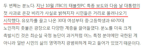 - JTBC의 태블릿PC 특종보도와 그에따른 박대통령의 사과로 시민들이 거리로 몰려나오기 시작