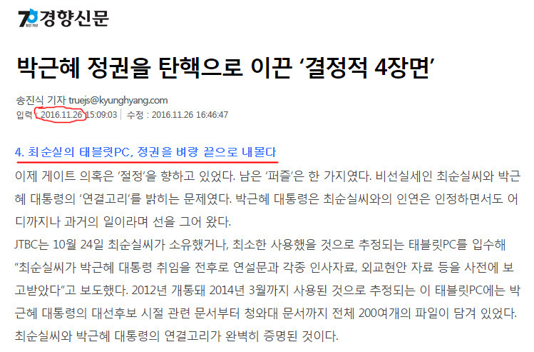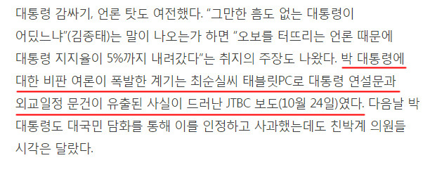 - 박대통령에 대한 비판 여론이 폭발한 계기는 JTBC의 태블릿PC 보도였다