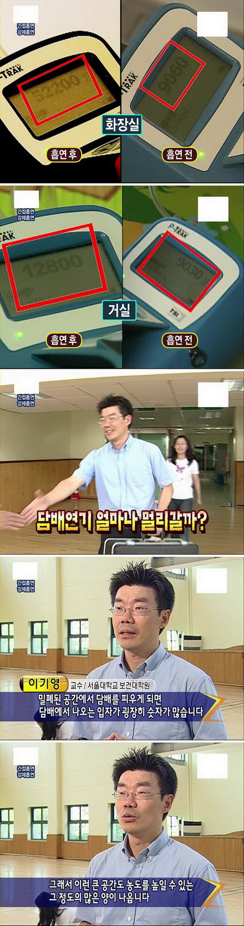 체육관에서 담배를 피운뒤 5분후 30미터까지 냄새가 퍼지고