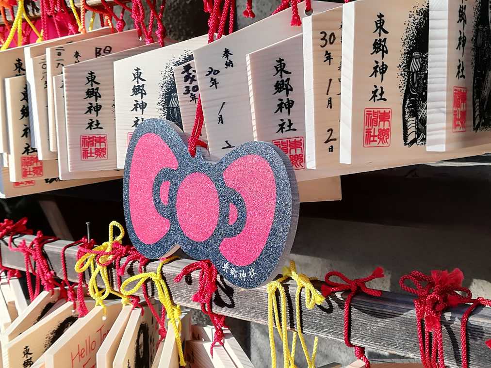 키티의 상징이기도 한 머리의 리본 에마 (손바닥 사이즈 나무 판자에 소원을 적어 거는 것) (700엔) 도 유명하다