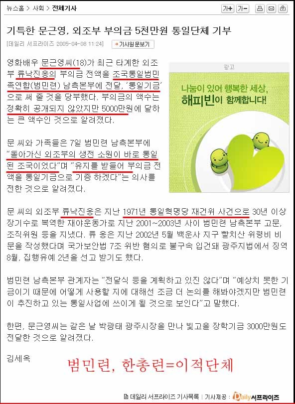 당시 유가족(문근영가족)은 장례때 들어온 부조금 5천만원을 반국가단체 범민련 남측본부에 기부한적도 있음.