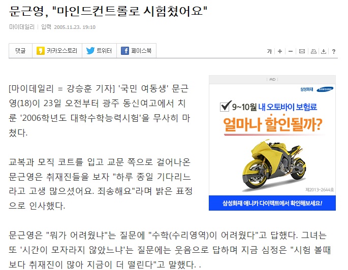 문근영의 인기탓에 광주시교육청은 문근영을 독방에 혼자서 수능을 보게 하였고, 수험생과 네티즌들 사이에서 논란이 일어남.