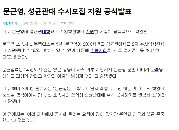 성균관대에 수시를 지원한 사실이 나중에 밝혀진다.