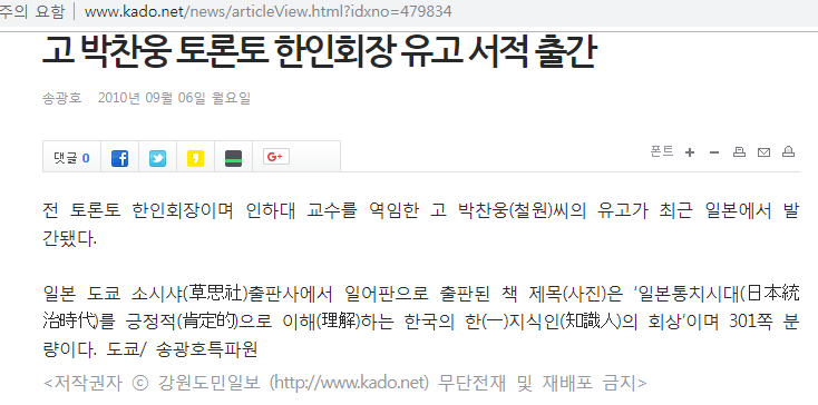상기 도서에 실리기 전에는 캐나다 한국일보에 기사로서 실렸지만, 지금은 삭제된 듯.