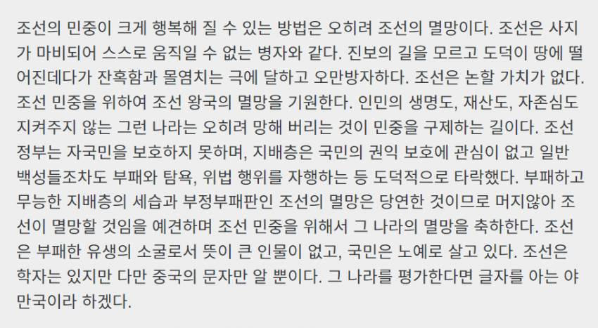 예능프로 '시간탐험대'를 한번 시청해봐라. 조선시대때 전체인구의 약 1%인 양반(관직을 가졌던)을 제외한 일반백성, 노비들은 말그대로 하루하루가 힘든 지옥에 살았다. 이러한 상황을 변화시켜준 나라(외세)가 일본이었다.