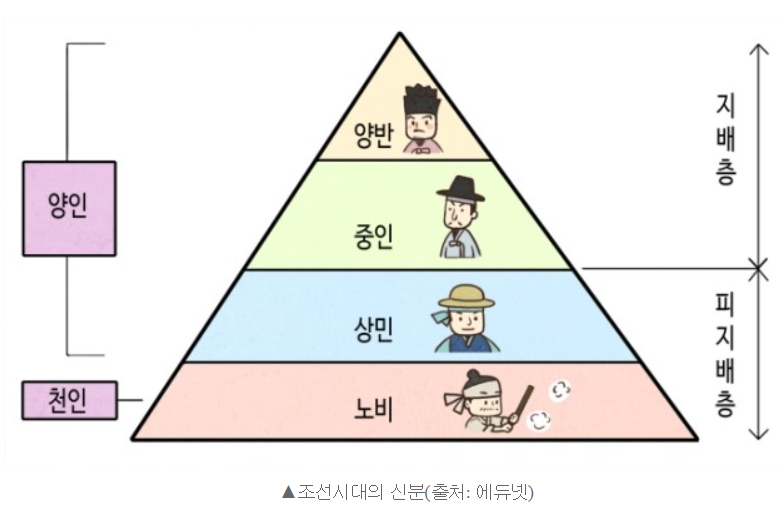 조선시대때 신분제도는 악명이 높았다. 1~2%불과한 양반들이 모든권력과 부를 독식하는 구조였다. 특히 노비제도가 공고하여, 전국민의 절반이 노비(노예)였는데, 노비는 사실상 인권이 없어서, 물건처럼 취급받고 양반이 죽이거나 불구로 만들어도 아무 문제가 없었다. 게다가 나라가 가난하여 공무원들에게 봉급을 주지 않자, 양반과 관리들은 백성들을 굶어죽을 때까지 수탈하였다.