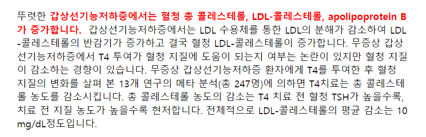 2. 갑상선 기능 저하증은 LDL 수치를 증가 시킴. ( 혈관나이 증가 )