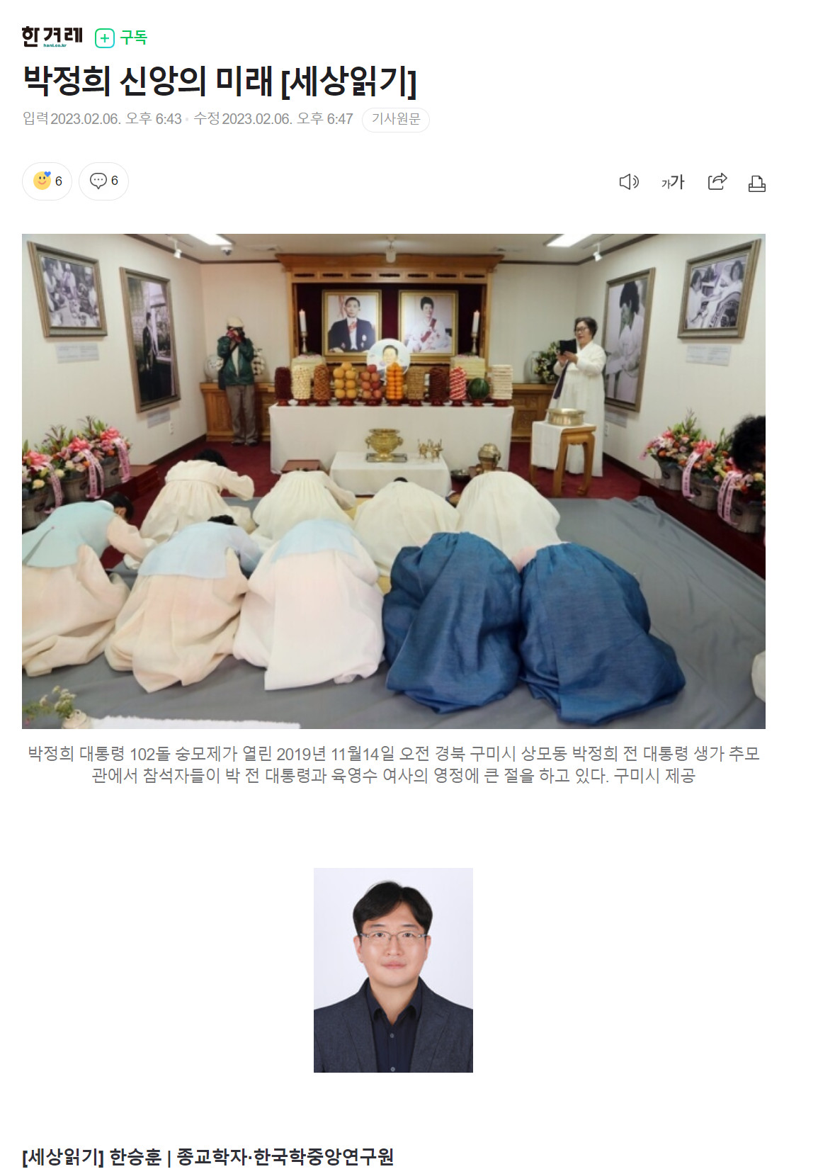 최근 박정희 신앙은 박정희 생가에 있는 의례 공간인 숭모관을 대규모로 확장, 신축하려는 경북 구미시의 계획이 알려지면서 새삼 주목받고 있다. 시민단체들의 반대 목소리도 만만치 않은 가운데, 윤석열 대통령은 지난 1일 이곳에 방문해 “박정희 대통령의 추모관이 너무 협소하다”며 힘을 실어주기도 했다. 지난 세기의 산물인 기괴한 종교현상을 자연적으로 쇠퇴해 가도록 둘지, 공적 영역으로 복귀시킬지 한국 사회가 결정해야 할 시기가 왔다.