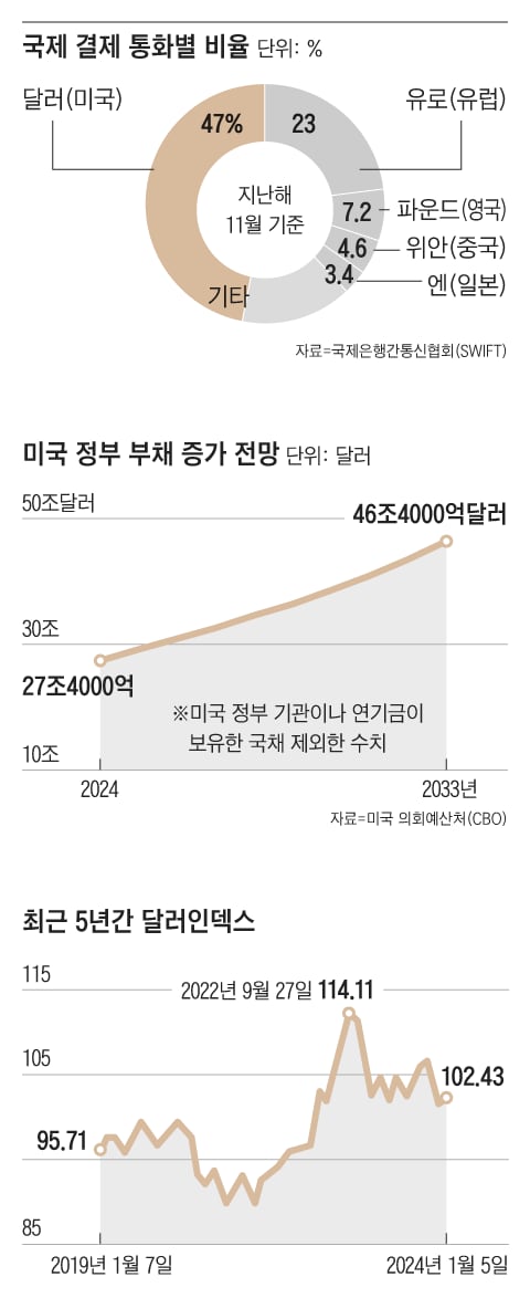 미국 부채가 해마다 늘어나는 가운데, 미국 정부가 이를 방치하면 할수록 달러 패권이 흔들릴 것이란 경고는 계속되고 있다. 7일(현지 시각) 미국 텍사스주 샌안토니오에서 열린 2024 전미 경제학회 연례 총회에서도 “미국 정부는 달러의 특권에 기대어 재정 지출을 늘리는데, 지출을 늘리다 보면 미국이 지급 불능(디폴트)까지 가지 않더라도 달러 지위가 위축될 수 있다”는 주장이 경제학자들 사이에서 나왔다. 코로나 사태 대응을 위해 막대한 재정 적자를 감수했던 미국 정부는 여전히 확장적 재정 정책을 이어가는 상황이다. 미국 의회예산처(CBO)에 따르면 올해 말 27조4000억달러 수준으로 예상되는 미국 국가 채무가 2033년 46조4000억달러까지 늘어날 것으로 예상된다. GDP의 100%를 훌쩍 넘긴다는 뜻이다.