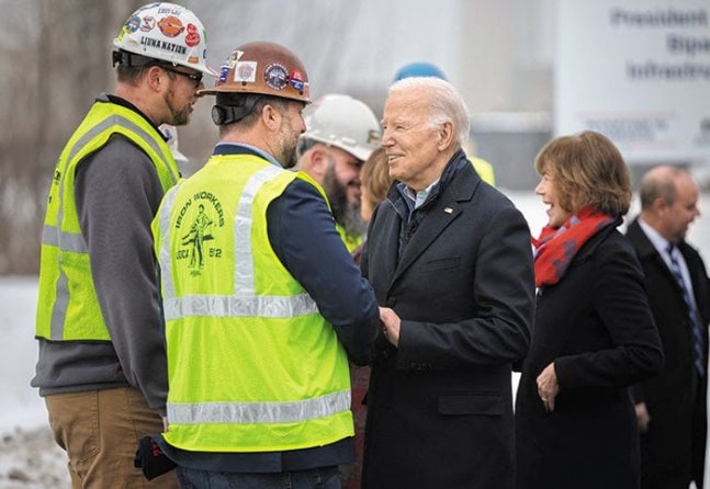 바이든 “운송 인프라 7조원 투자” - 조 바이든 미국 대통령이 지난 25일(현지 시각) 위스콘신주 슈피리어에서 7조원 규모의 운송 인프라 투자 계획을 밝힌 뒤, 건설 근로자들과 인사를 나누고 있다. /로이터 연합뉴스