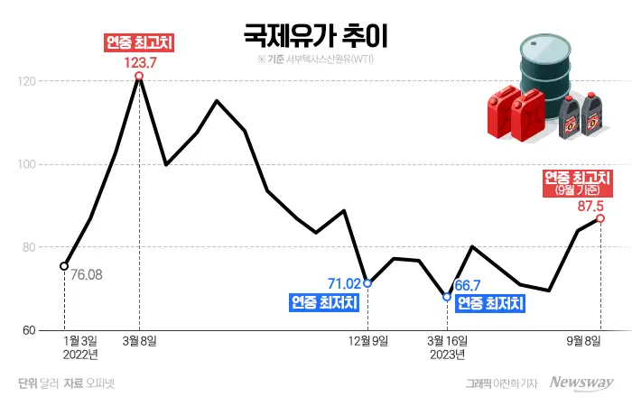 미국이 맘 먹고 사기맵 빨대 꽂아버리니 급등하던 국제 유가는 2022년 말을 기점으로 하락세를 보였고,