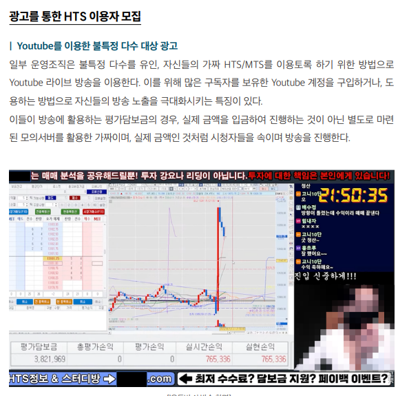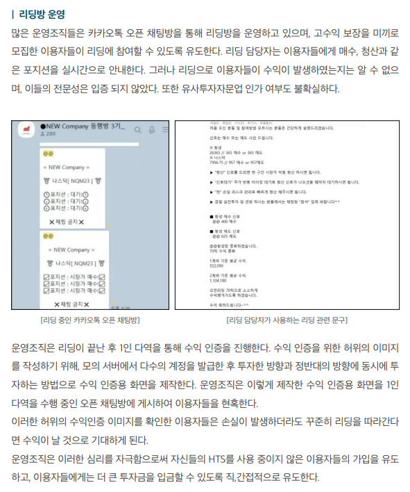 관련 사기수법의 분석 결과, ‘운영조직’은 리딩방 명목의 카카오톡 오픈채팅, 유튜브 라이브 방송 등 다