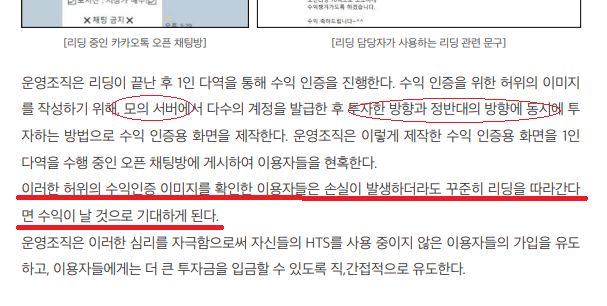 1인 다역을 수행하며 투자자들을 선동하고, 가짜 수익 화면 캡처를 인증하여 이용자들이 리딩에 현혹