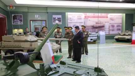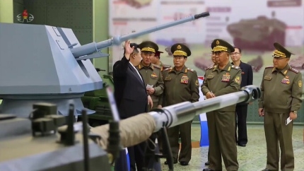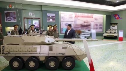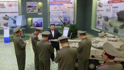 | 김정은 북한 국무위원장이 지난달 29일 국방과학원 전시관을 찾아 군 관계자들과 함께 대구경 주포 탑재 장갑차를 살피고 있다. 조선중앙TV 캡쳐 |