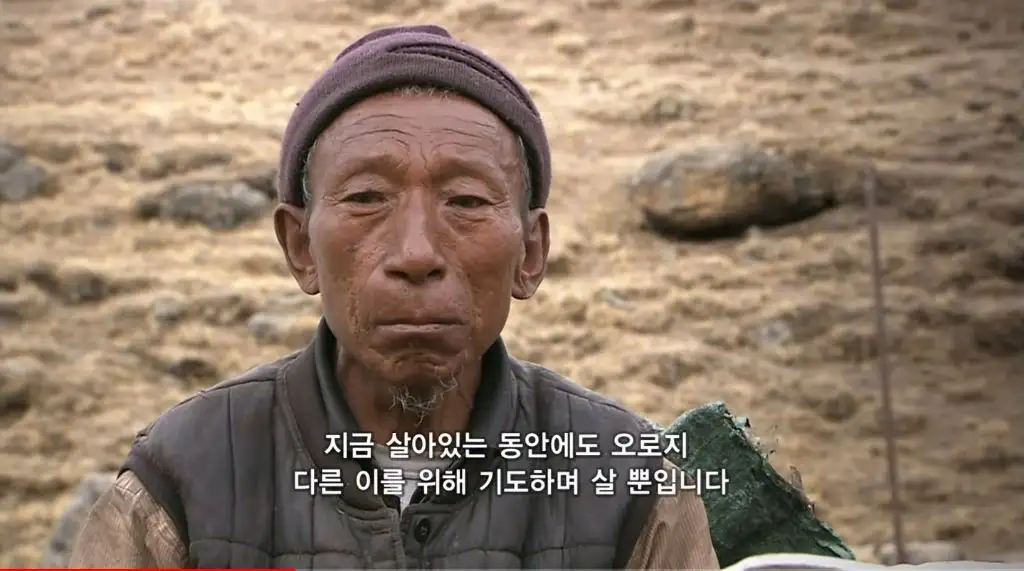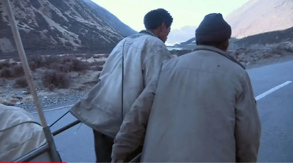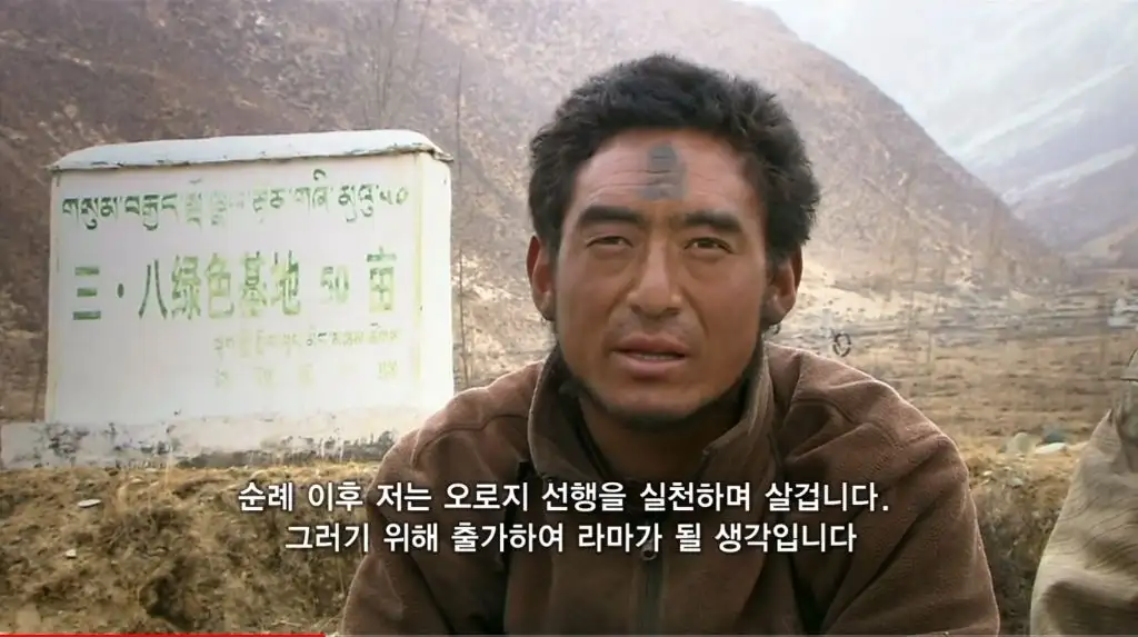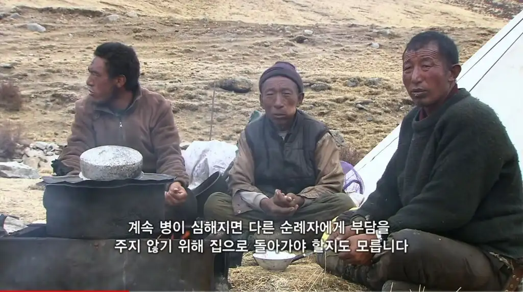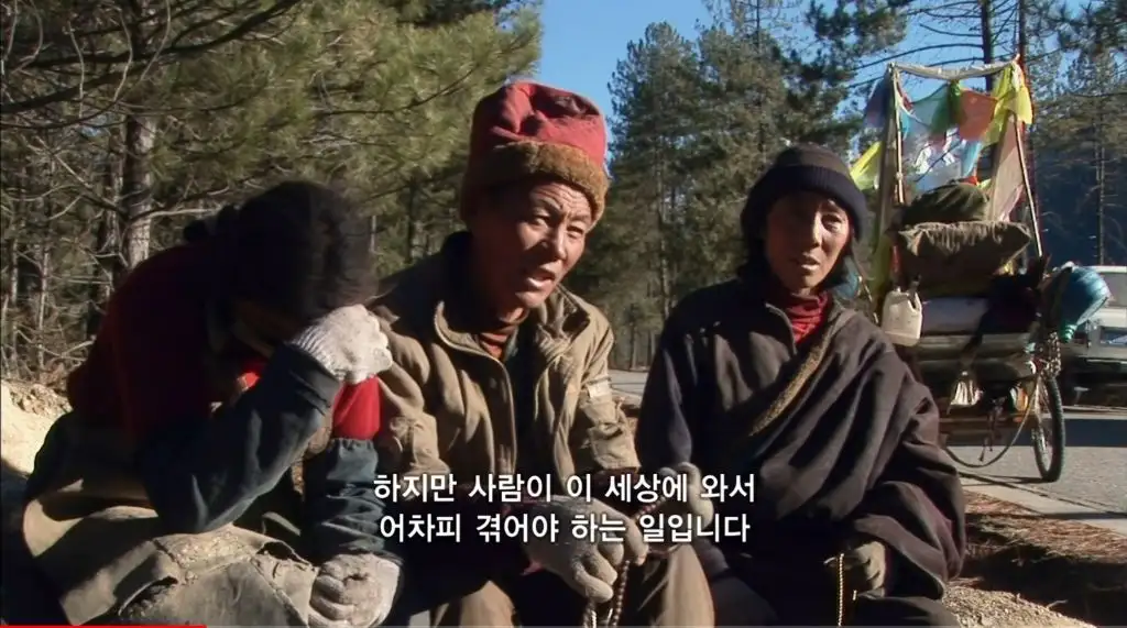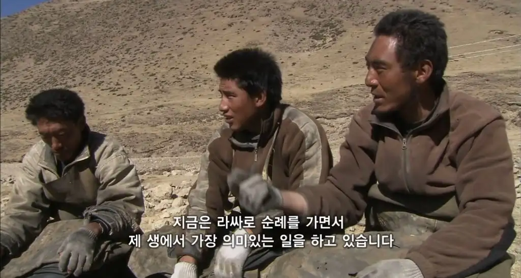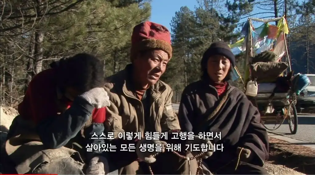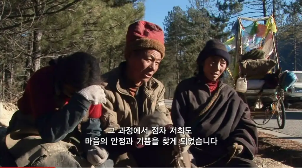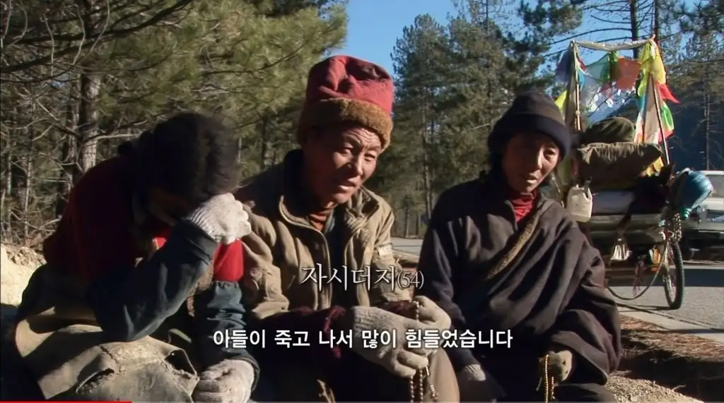 오체투지를 하던 마을 청년이 대신 짐을 끌어주고