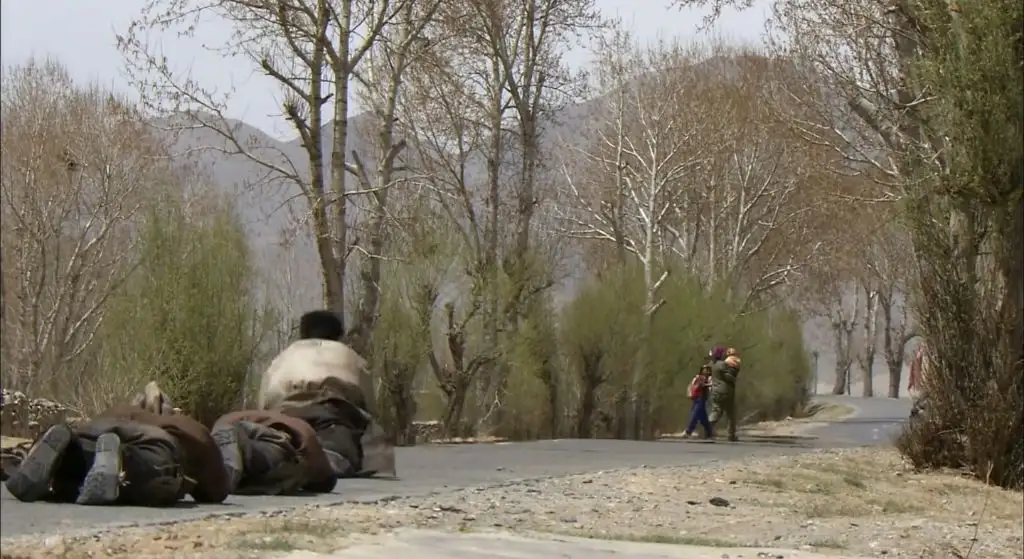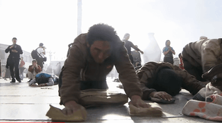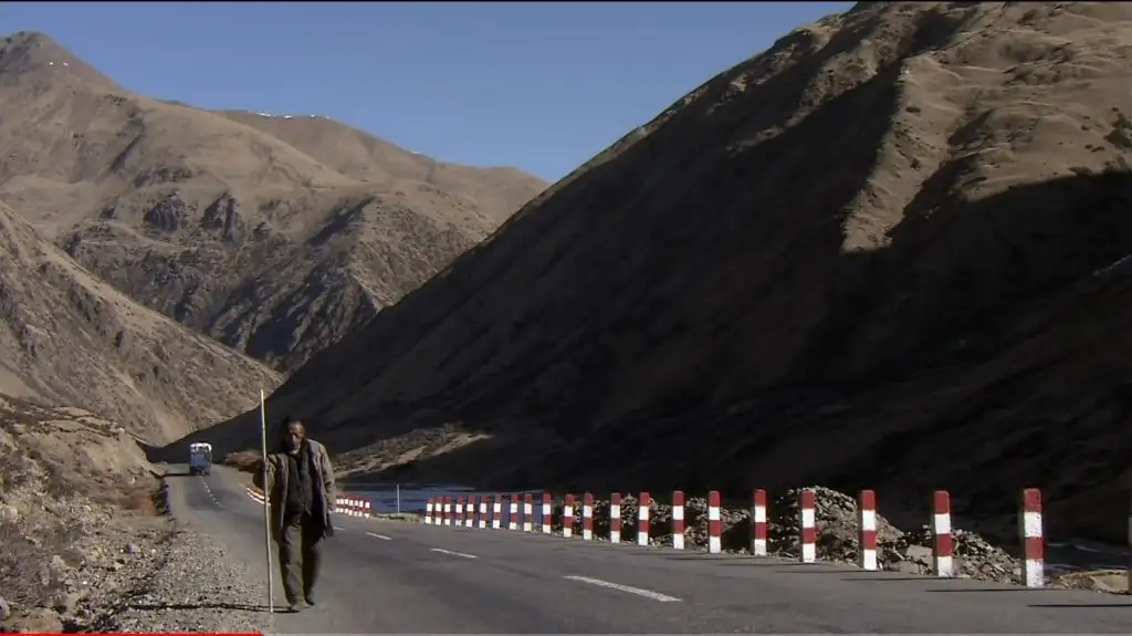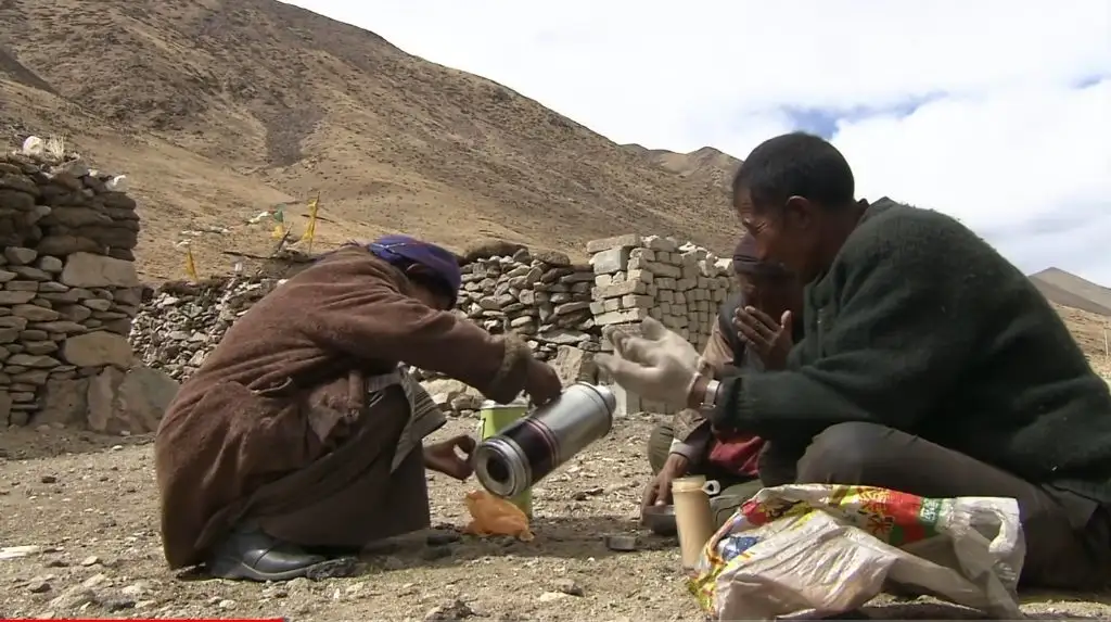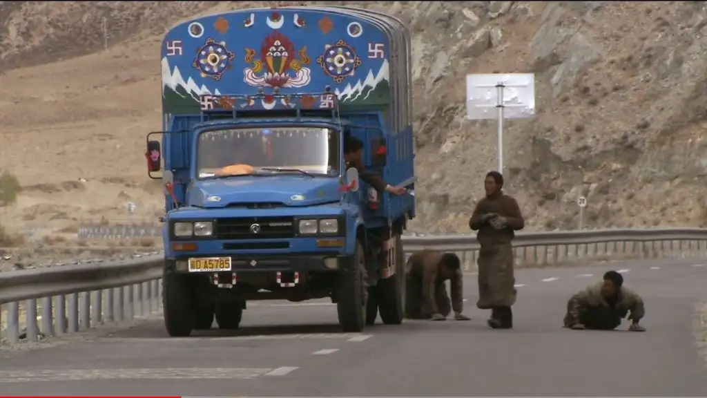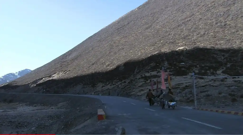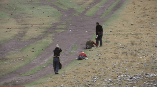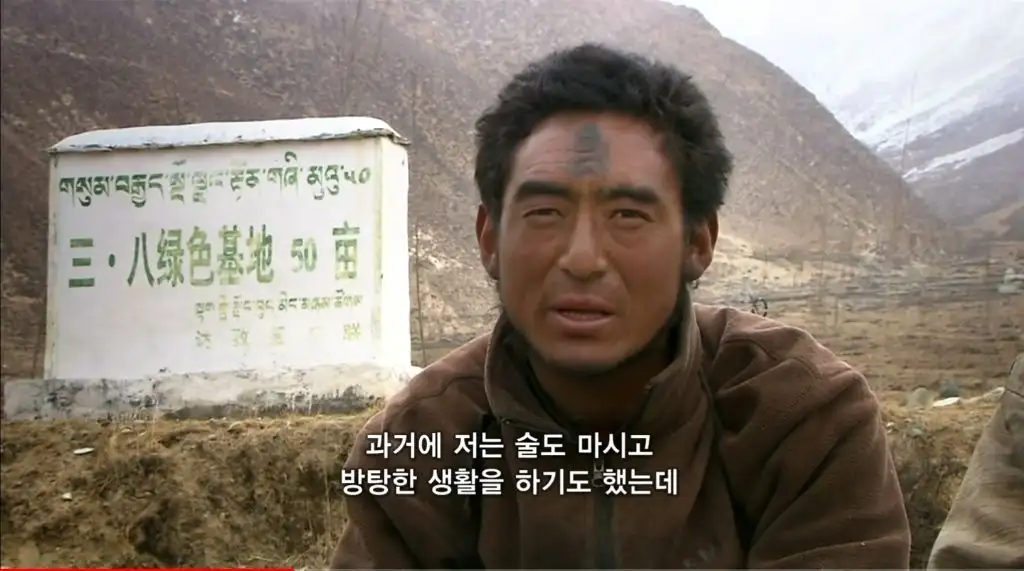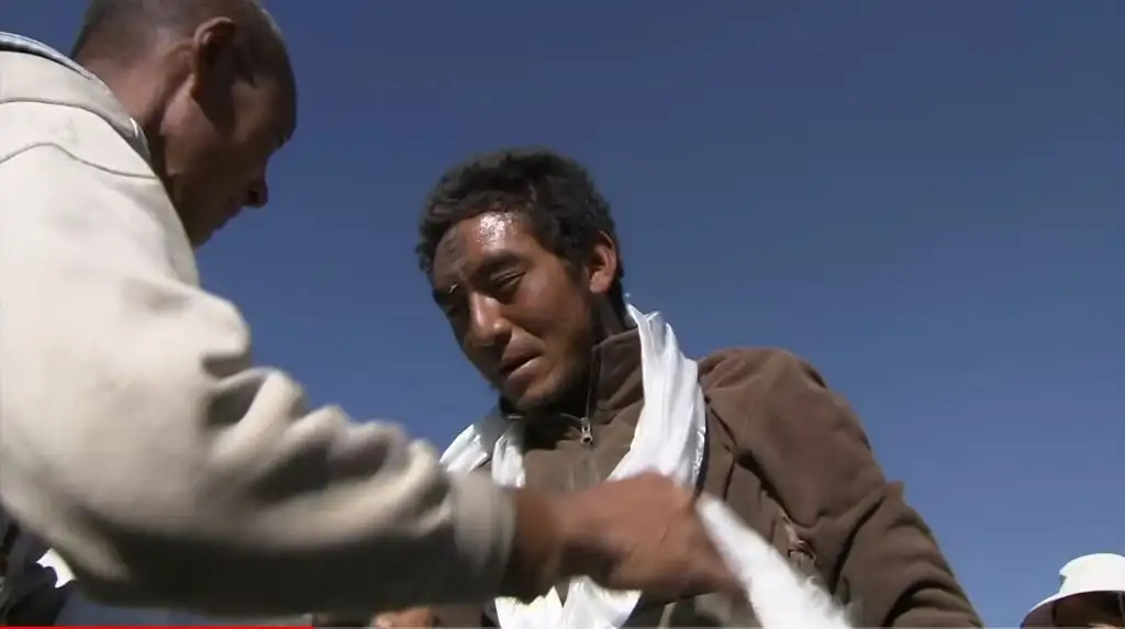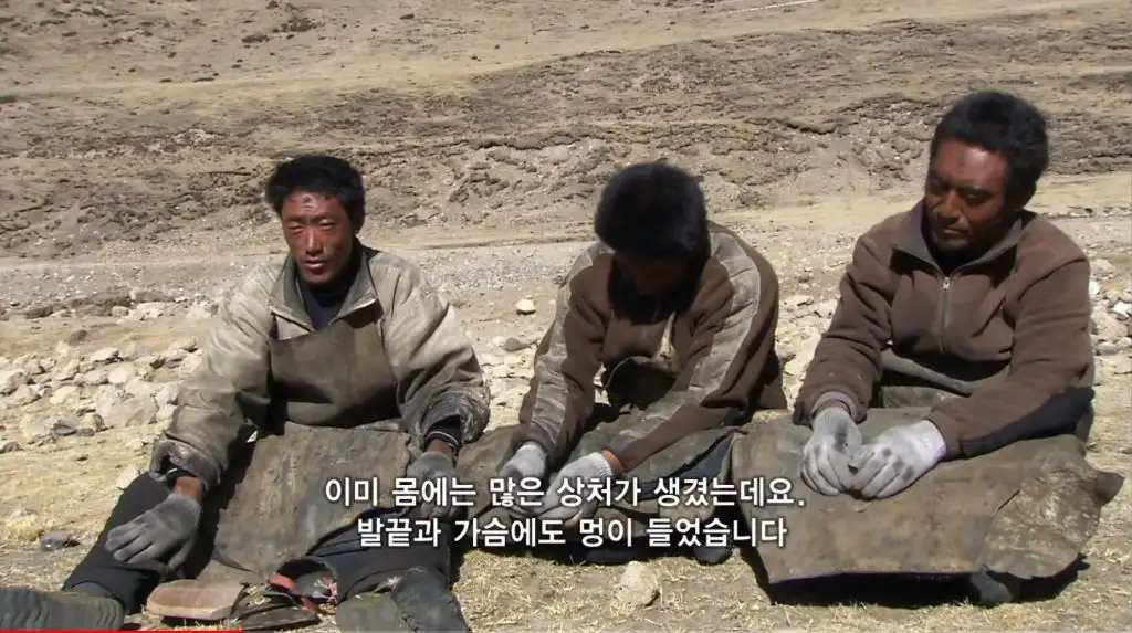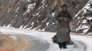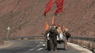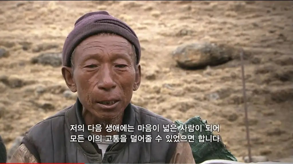 오체투지를 하던 마을 청년이 대신 짐을 끌어주고