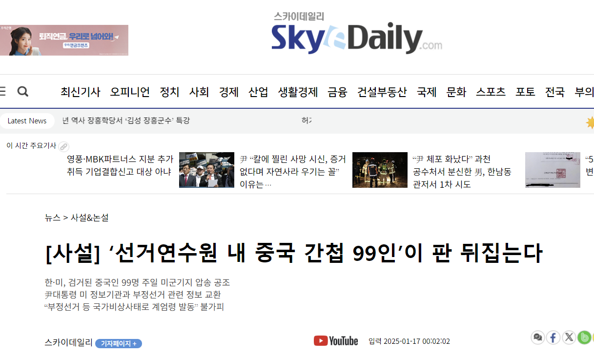 [스카이데일리 사설] ‘선거연수원 내 중국 간첩 99인’이 판 뒤집는다.