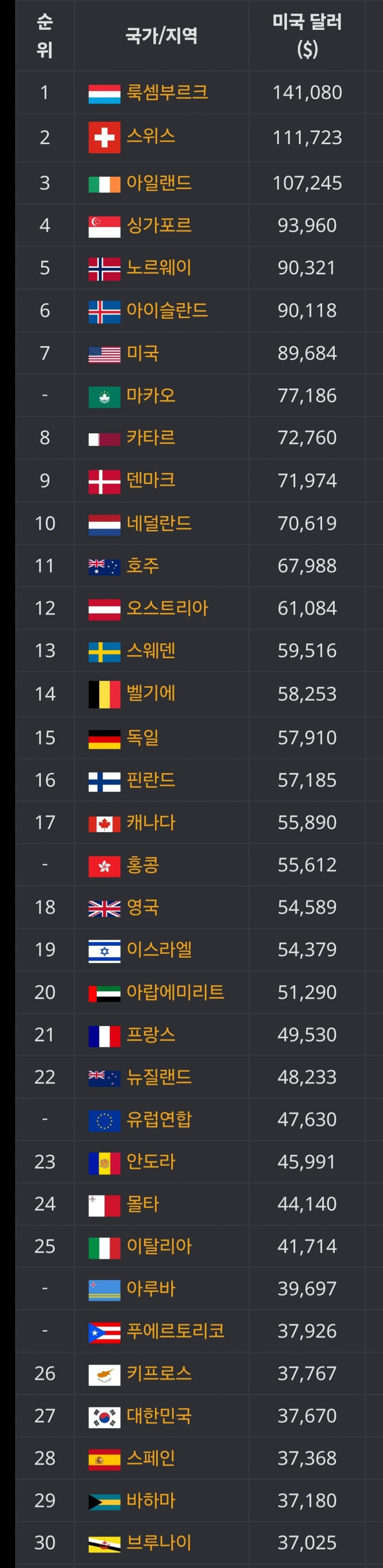 아일랜드 1인당 gdp는 뻥튀기인게 다국적 기업들이 세금 피하려고 본사 박아놔서 실제에 비해 오지게 높음